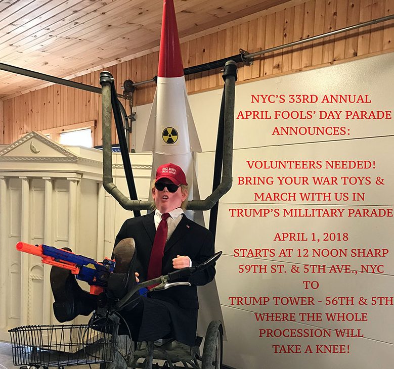 If you’re in New York City on Sunday, April 1, 2018, join the April Fools’ Day Trump Military Parade and show the world how grandiose and out of touch America’s leader really is.