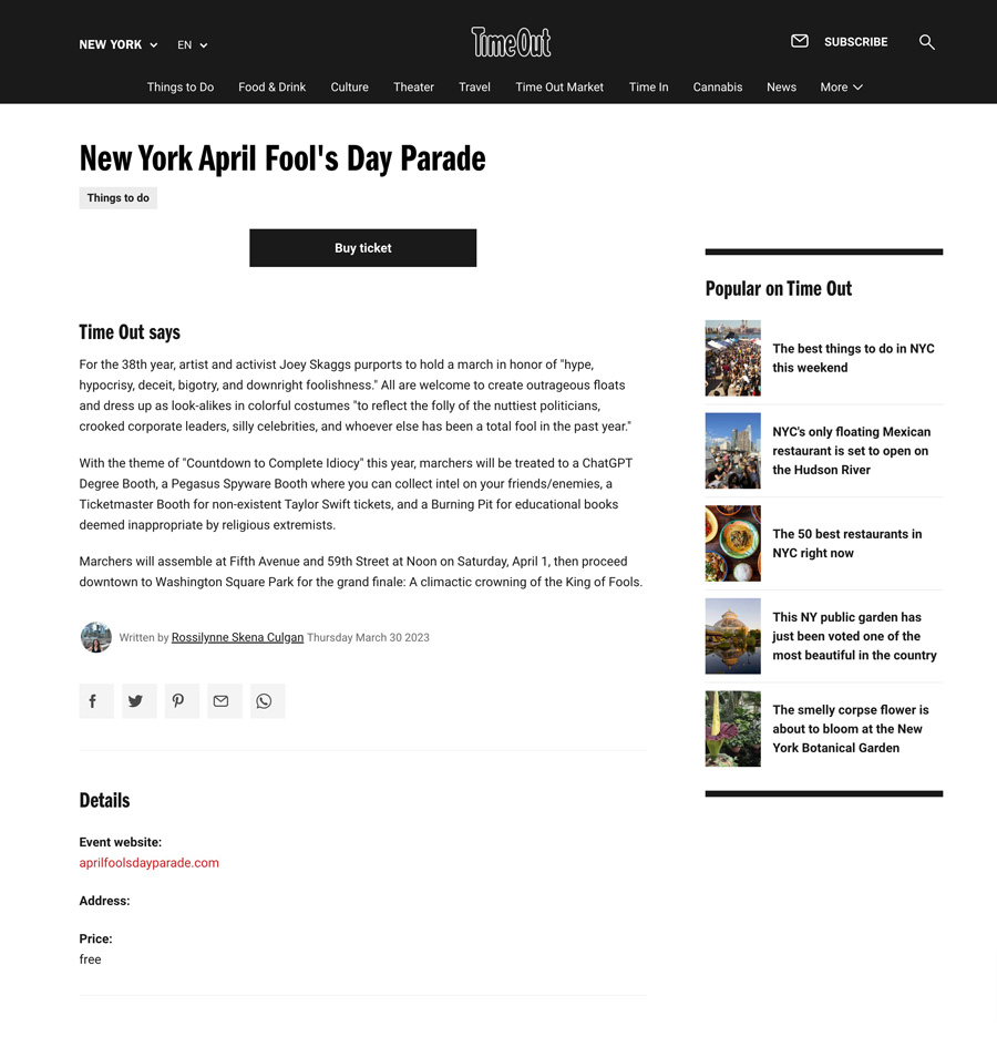 On April 1, 2024, the theme for the 39th Annual April Fools’ Day Parade was Democracy at the Guillotine. Watch the video: