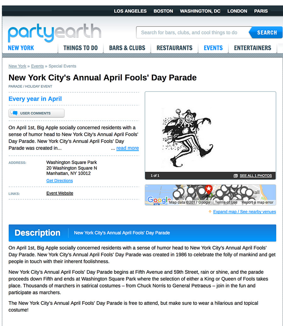In 1986, Joey Skaggs launched his first annual April Fools’ Day Parade which traveled down 5th Avenue from 59th Street to Washington Square Park in New York City. This was to be the beginning of a tradition that is ongoing today. Every year floats portray the most outrageous media events and marchers emulate their favorite fools of that year. Spectators are invited to join the parade with or without costumes. At the end of the parade route at Washington Square Park, there’s a huge celebration and a King or Queen of fools is selected by audience acclaim from the list of nominees.