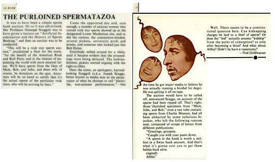 In July of 1976, Giuseppe Scaggoli, proprietor of the Celebrity Sperm Bank, planned to hold an auction of rock star sperm in New York City. The sperm bank promised, “We’ll have sperm from the likes of Mick Jagger, Bob Dylan, John Lennon, Paul McCartney, and vintage sperm from Jimmy Hendricks. All donations are certified and authenticated.” Scaggoli (a.k.a. Joey Skaggs) asked about 50 actor friends to gather on Waverly Place between 6th Avenue and MacDougal Street, in front of the brownstone home of his attorney. They put up a name plate that said Celebrity Sperm Bank.