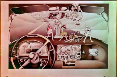 In 1970, Joey Skaggs conceived a multi-media theatrical musical called “Coupe de Ville.” The entire theater was designed to resemble the inside of a 1950s-era Cadillac Coupe de Ville automobile. The stage was a giant dashboard complete with a steering wheel, instrument panel, radio, and ashtray. The windshield served as a movie screen showing what was happening outside the car, while the rear-view mirror was another screen displaying the people inside the car. The objects on the dashboard, including a plastic Jesus, a pair of sunglasses, a pack of cigarettes, baby booties, a skull, two magnetic Scottie dogs, a hula girl, and a pair of dice, were the actors. These objects formed the “Greek chorus” whose dialogue propelled the plot as the car changed owners, each with their own compelling stories.