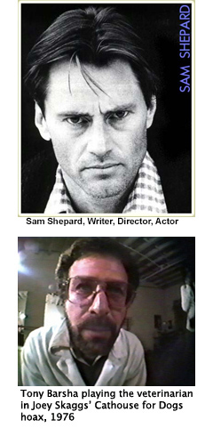 Sam Shepard went on to write and direct prolifically, becoming, by 1980, the most produced playwright in America after Tennessee Williams. He also became a well-known Hollywood actor. Tony Barsha continued to write and direct. He also taught screenwriting at NYU. Over the years, he had cameos in several of Skaggs’ performances, appearing as the veterinarian in his Cathouse for Dogs in 1976, playing a bad guy in Skaggs’ Bad Guys Talent Management Agency in 1984, and appearing as a commando in the Fat Squad in 1986.
