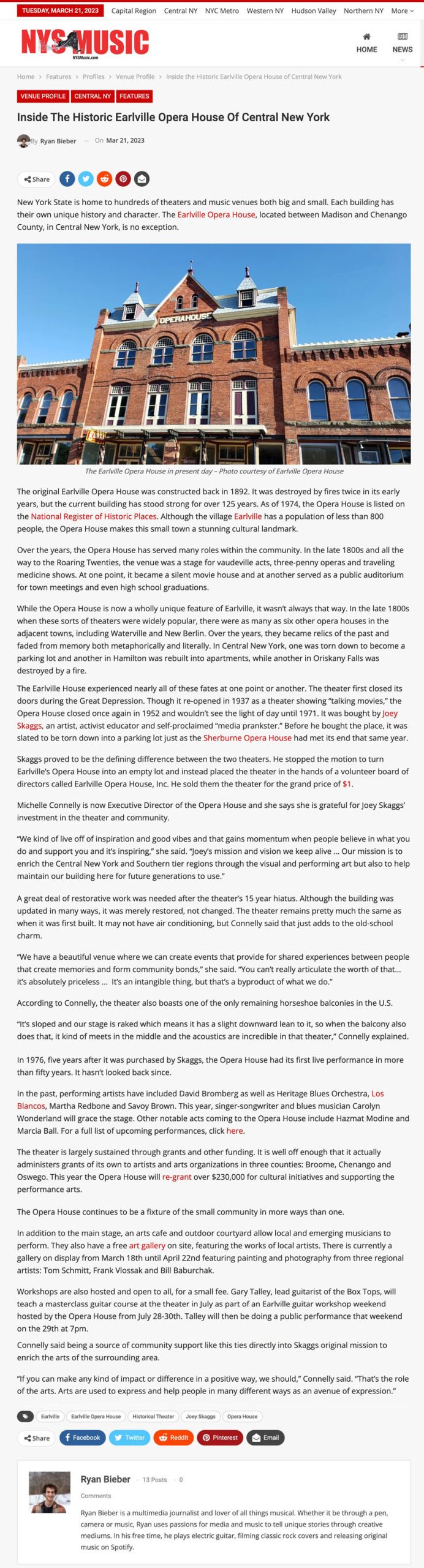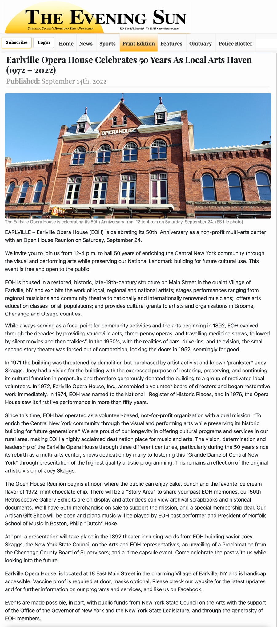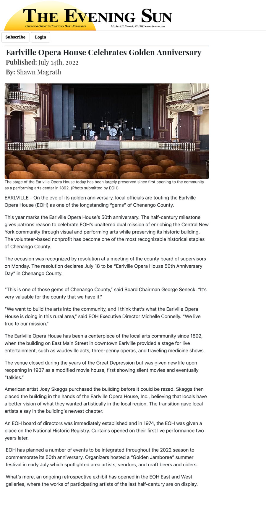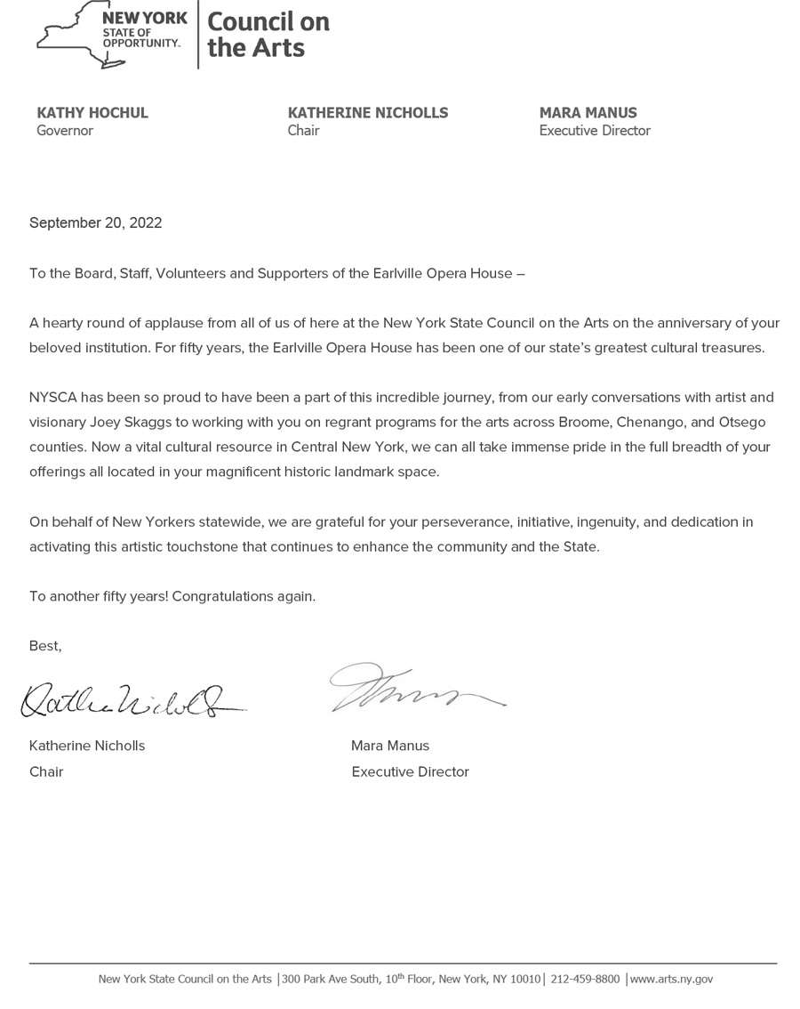 In 2022, the Opera House celebrated its 50th Anniversary. Deservedly, the exceptional organization received a Proclamation from the Chenango County Board of Supervisors, the ‘Not-for-Profit Agency’ of the Year award from Commerce Chenango, and a letter of praise and congratulations from the New York State Council for the Arts (see below).