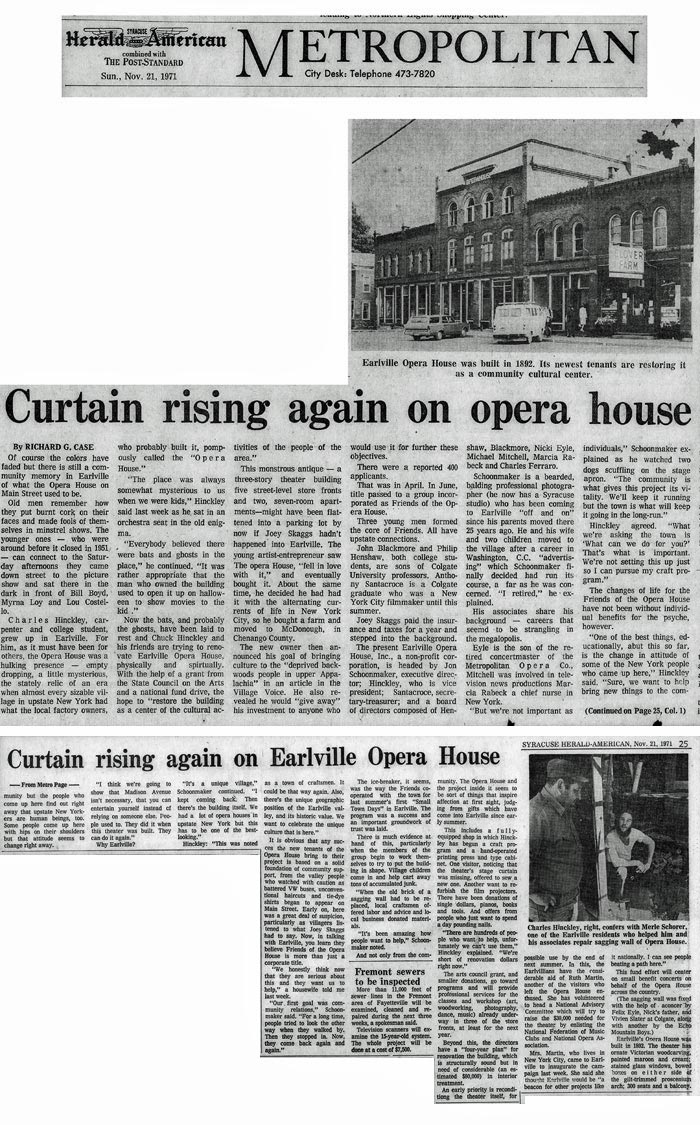 His desire was to see the opera house reconstructed and revitalized. He felt that it’s proximity to Colgate University was a benefit, and that the community would much rather have a restored beautiful work of architecture in its town than a parking lot. Towards that end, he met with local politicians and civic organizations so they could understand his vision and become actively involved. This being the early 70’s, and his being a relative outsider, some local people expressed distrust and suspicion about his interest in the project.