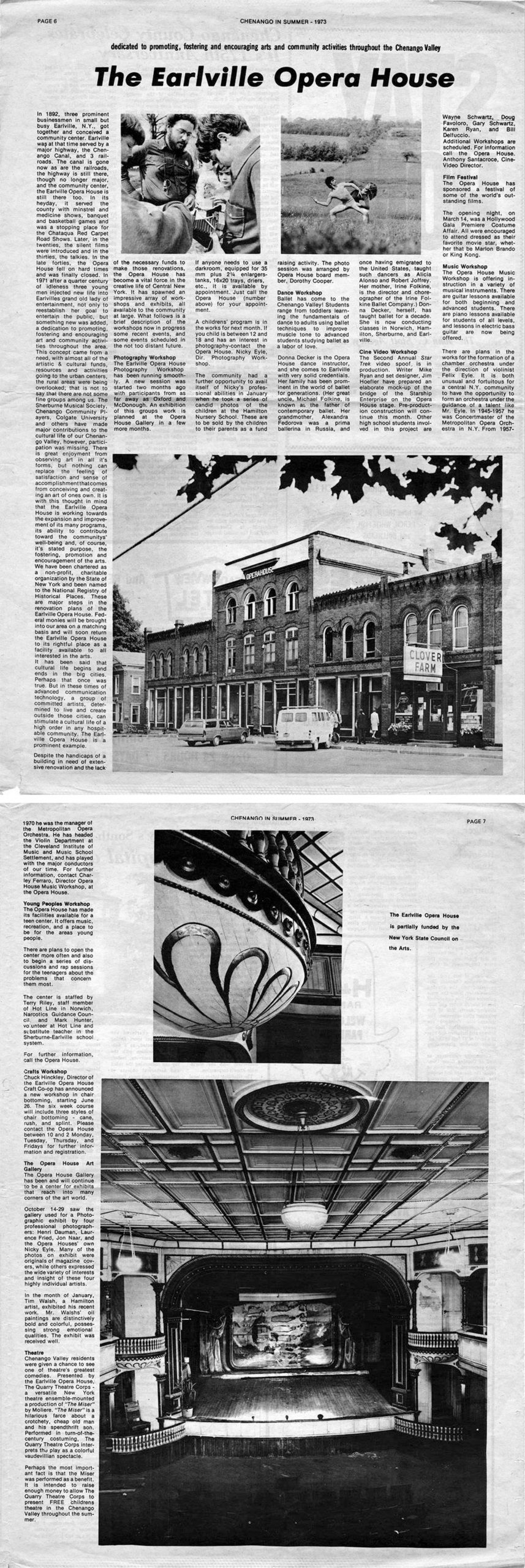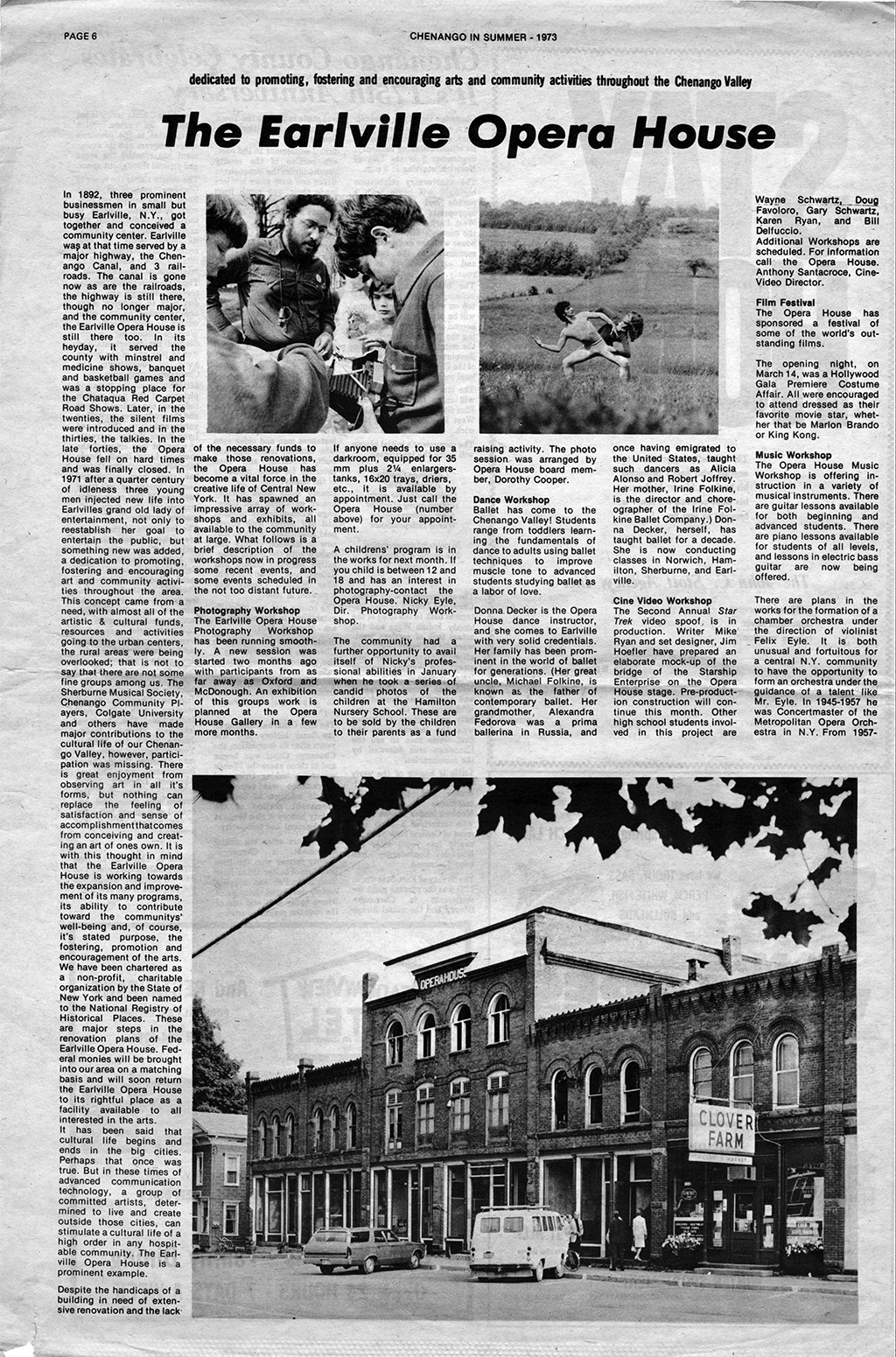 He ultimately chose a group of people with roots in the area so that the project could be supported from within the community. He then donated the Opera House to this group for $1.00 with the understanding and promise that its life long function would be to benefit the community and that it would never be sold for profit. In 1973, the opera house was added to the National Register of Historic Places.