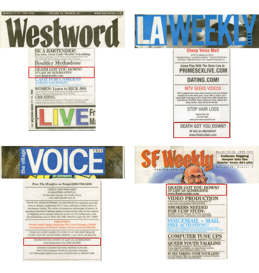 Skaggs sent out press announcements and placed classified ads in numerous newspapers across the country which said, “Death got you down? At last an alternative: www.finalcurtain.com.” This led the press and public to the website.