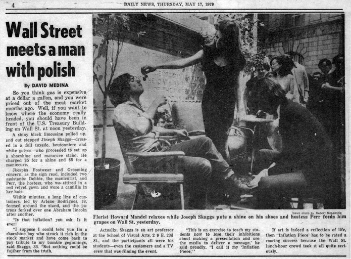 Mr. Bucks (a.k.a. Joey Skaggs) pulled off this street theater with the help of friends and his Media Communications students at the School of Visual Arts. The piece was about inflation and conspicuous consumption. And, Skaggs’ students, by actively participating in the satire, learned first-hand how to access the media to deliver a message.